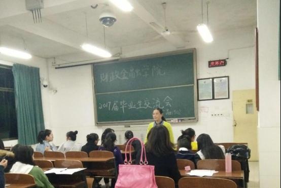 4月11日晚,财政金融学院在乐知楼(三教学楼)组织召开了2017届毕业生座谈会。座谈会以分班进行的形式开展,参加座谈会的老师有财政金融学院曹秋菊副院长,学业导师王小翠、吕颖毅、许鸿文、罗长青等,以及各毕业班的班主任。