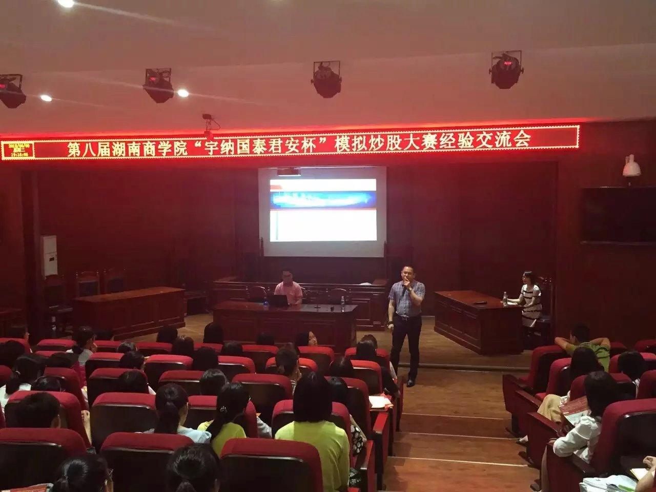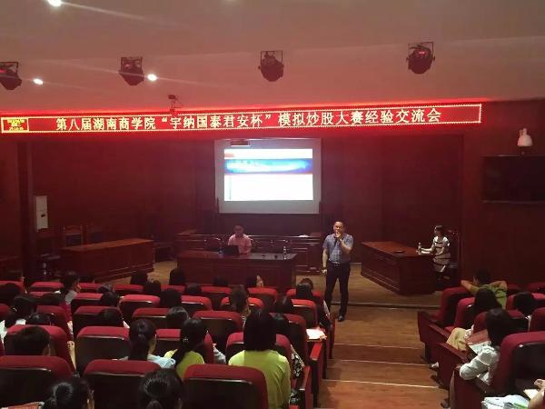 2015年6月9号晚7点, 第八届湖南商学院“宇纳国泰君安杯”模拟炒股大赛经验交流会在模拟法庭成功举办。本次活动由湖南财政金融学院主办、大学生投资理财协会承办、湖南宇纳投资管理有限公司和同国泰君安证券湖南分公司冠名。在经验交谈会上,有着七年从业经验,多年操盘经验的85后总经理不仅为我们分析的股票投资的现状,还给我们打开了股票市场的知识大门。 他为我们细致的讲解了关于如何选择股票的技巧和经验,并为此推荐了几种股票类型 。在接下来的问答交流环节,他更是细致的解答来自学生不同的疑惑和难题,也为了众多参加模拟炒股的参赛者有了更多的信心和方向