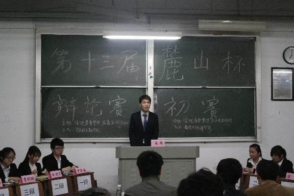 2015年4月24日晚7点,湖南商学院麓山杯院级辩论赛初赛一组在C106教室顺利举行。此次比赛特邀两位老师担任评委,王一工担任学生评委,由陈一峰担任主席。本次比赛在财政金融学院与数学与统计学院两院之间展开。在双方简洁的自我介绍后,比赛正式开始。双方就“实现青春梦想先行后知还是先知后行”的问题展开辩论。正方财政金融学院认为“实现青春梦想先行后知”,而反方数学与统计学院则坚持“实现青春梦想先知后行”的观点。