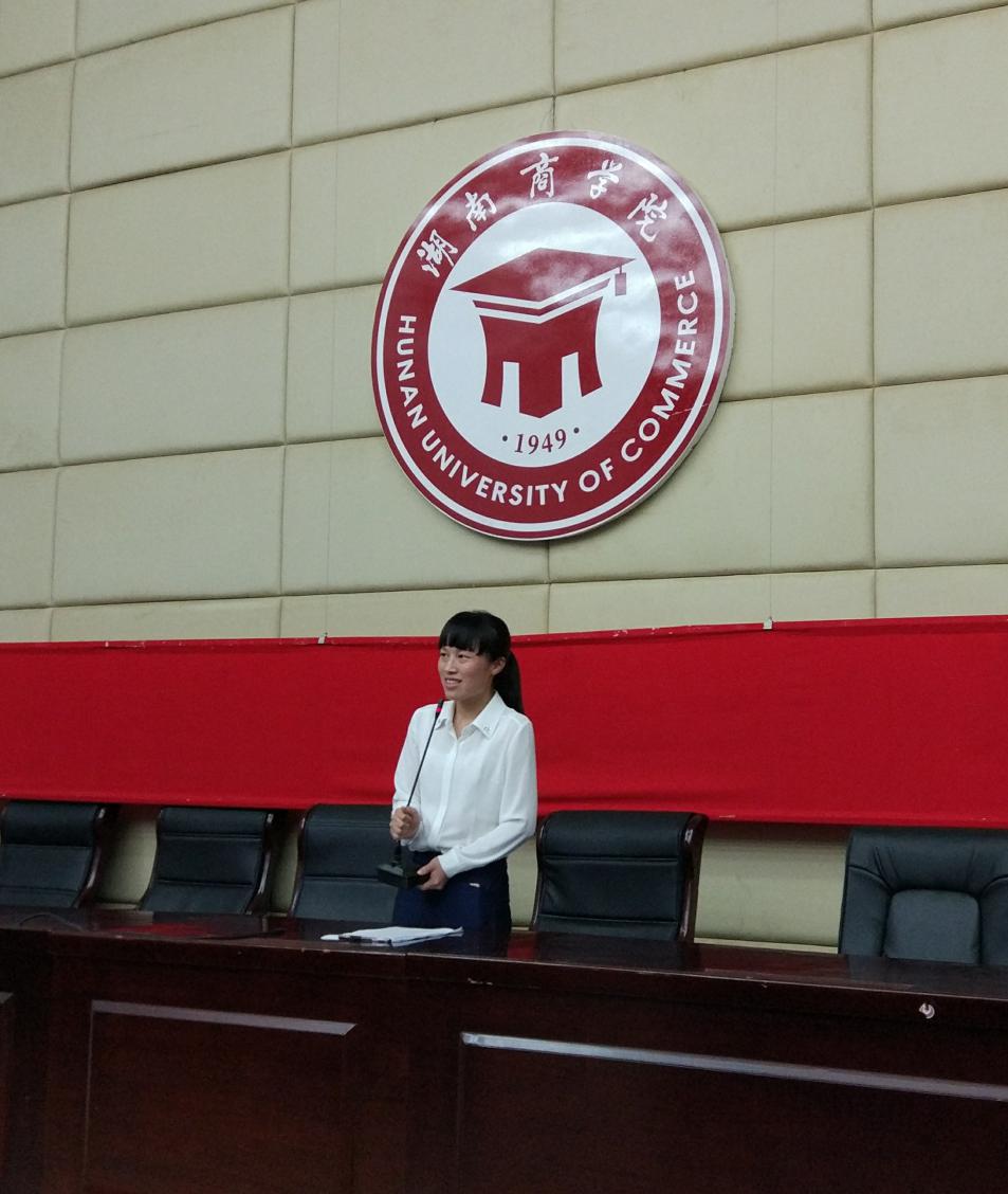张高阳老师首先向同学们介绍了鲁定红的基本情况。他说,鲁定红虽然出身草根,但是凭着自己的顽强意志,依靠勤奋刻苦的实干精神开启了她的别样人生。她家境贫困,但她志不穷,她在校期间积极上进、志存高远,曾担任湖南商学院经济学系第五学生党支部青年委员、财政学0301班级团支书;曾获湖南商学院“践行八荣八耻先进个人”、院级综合素质奖、湖南省特困优秀大学生、省政府一等奖学金、国家助学金等荣誉奖励;曾积极参加各类学生社团,是校园中的活跃分子。鲁定红勤奋好学、成绩优异,大学四年几乎获得了学校的各类奖学金,不仅让自己顺利完成学业,还用毕业时余下的奖学金支助亲弟弟上了大学,用自己的青春时光和实际行动诠释了什么是责任和担当。