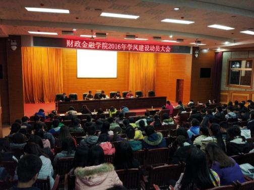为了进一步加强学风建设,努力营造良好学习氛围,11月30日晚,财政金融学院在校本部图书馆多功能报告厅召开2016年学风建设动员大会。财政金融学院党总支书记刘赛红、党总支副书记高俊杰、副院长曹秋菊、副院长颜伟,学院全体教师、班主任、辅导员、学业导师,以及各班班长、团支书、寝室长,共300余人参加了会议。会议由颜伟副院长主持。
