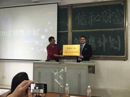 在此活动中,校党委副书记夏继春与信和财富长沙支公司城市经理潘建锋举行了“湖南商学院金融人才综合培养基地”的授牌仪式,财政金融学院党总支部书记刘赛红与长沙湘江万达营业部副经理邹明帆就关于培养金融人才的合作进行了签约仪式,潘建锋经理还就信和财富推出的“雏鹰计划”进行了生动的宣讲。
