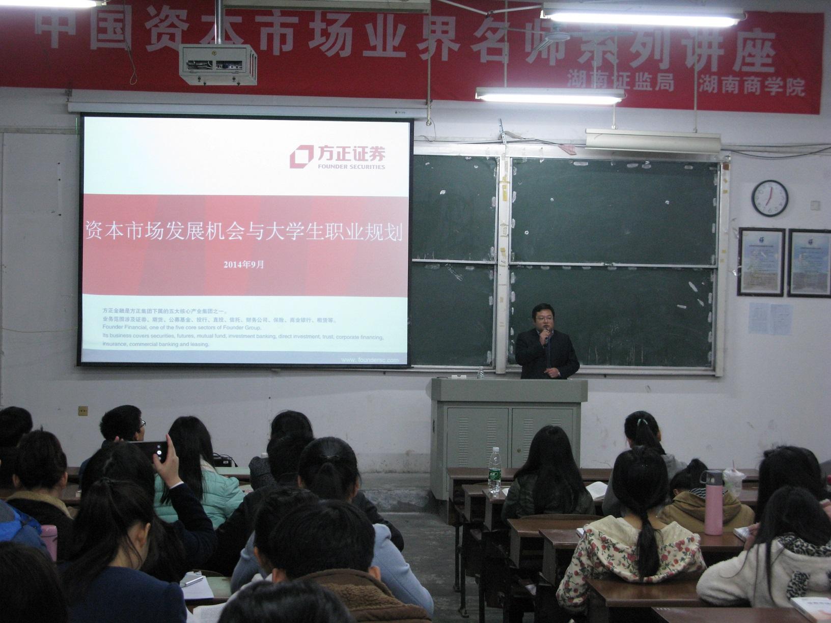 2014年11月26日晚7点,由湖南省证监局与财政金融学院举办的资本市场基础知识系列讲座第十场讲座在第二教学楼D304举行,这次本次“资本市场基础知识”系列讲座的最后一次讲座。此次讲座,由于方正证券副总裁施光耀先生出差在外,委托方正证券张正华先生为我们做资本市场发展机会与大学生职业规划,到场参加讲座的师生有150多人。