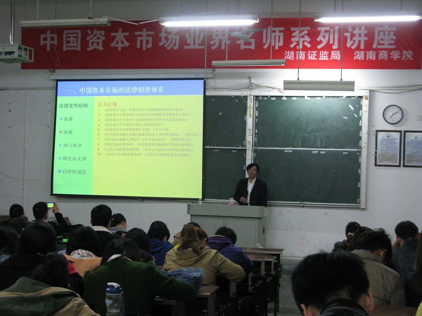 2014年11月19日晚7点,由湖南省证监局与财政金融学院举办的资本市场基础知识系列讲座的第九场讲座在第二教学楼D304举行。此次讲座,特邀湖南证监局调研员曹立先生为我们做资本市场法律制度与监管的专题讲座,到场参加讲座的师生及知名企业总经理等共计200多人,教室座无虚席。