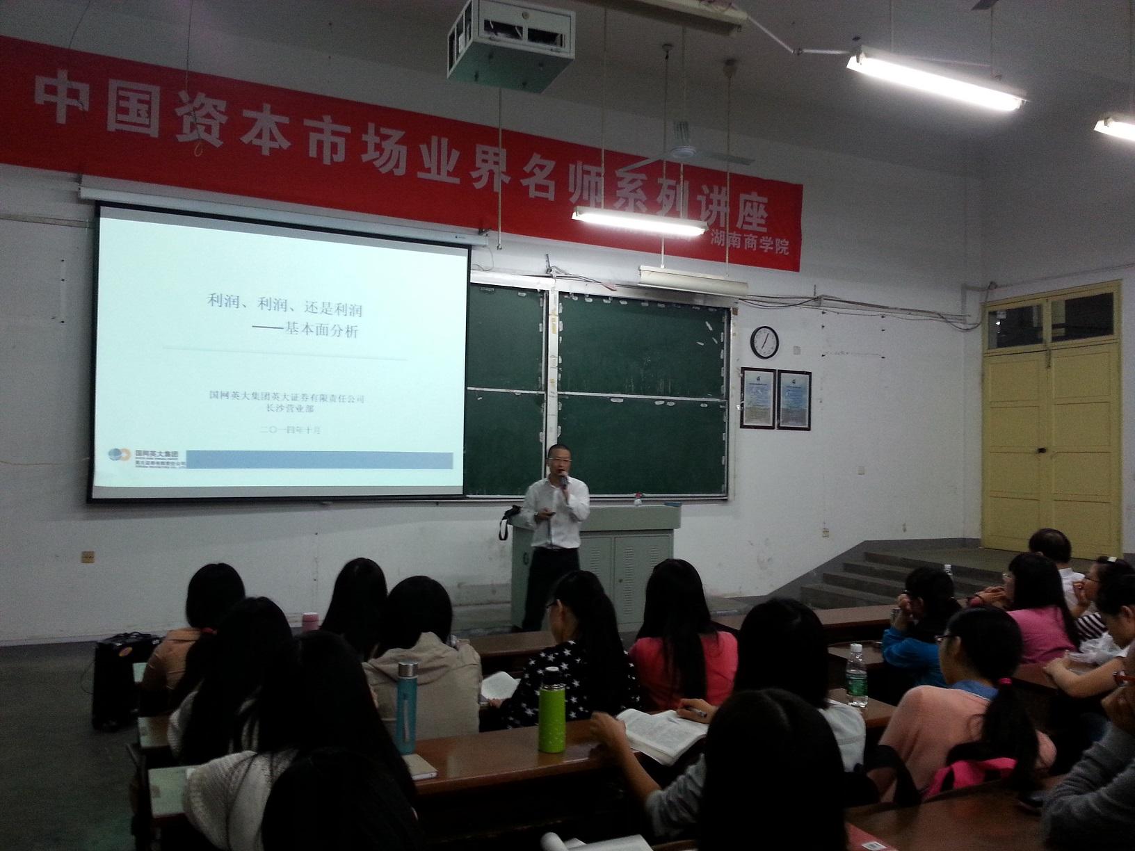 2014年10月22日晚7点,由湖南省证监局与财政金融学院举办的资本市场基础知识系列讲座的第五场讲座在第二教学楼D304举行。此次讲座,特邀段春超先生为我们做证券投资的基本面分析的专题讲座,到场参加讲座的师生共有200多人,教室座无虚席。