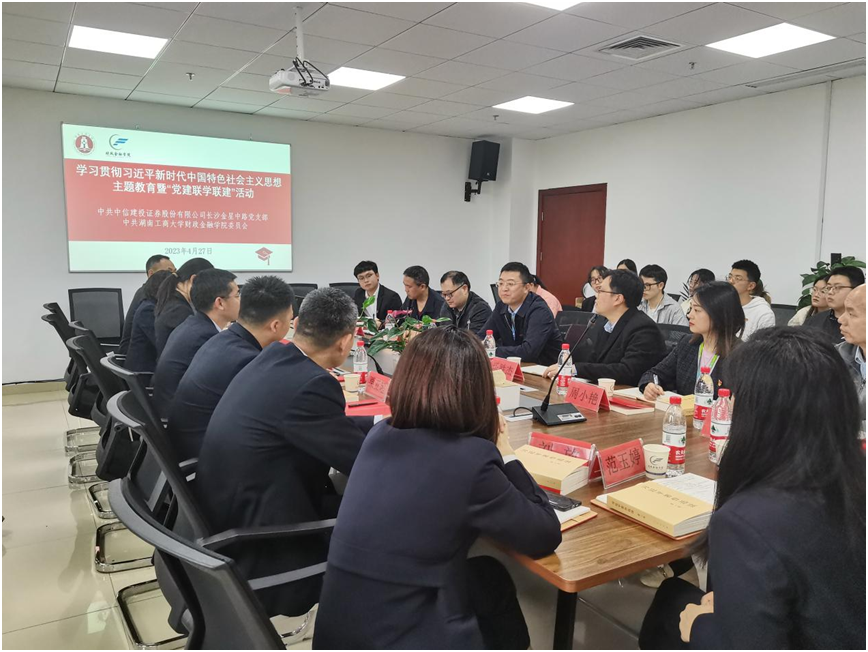 为推动学院学习贯彻习近平新时代中国特色社会主义思想主题教育,2023年4月27日下午,财政金融学院党委与中信建投金星中路营业部党支部在经管楼B601会议室开展了学习贯彻习近平新时代中国特色社会主义思想主题教育暨校企“党建联学联建”活动,活动由黄晨同志主持,财政金融学院党委副书记尹元元(牵头党委工作)、部分教师党员、本科生第一、第三党支部部分学生党员、中信建投金星中路营业部党支部书记唐飞及全体党员共同参与。